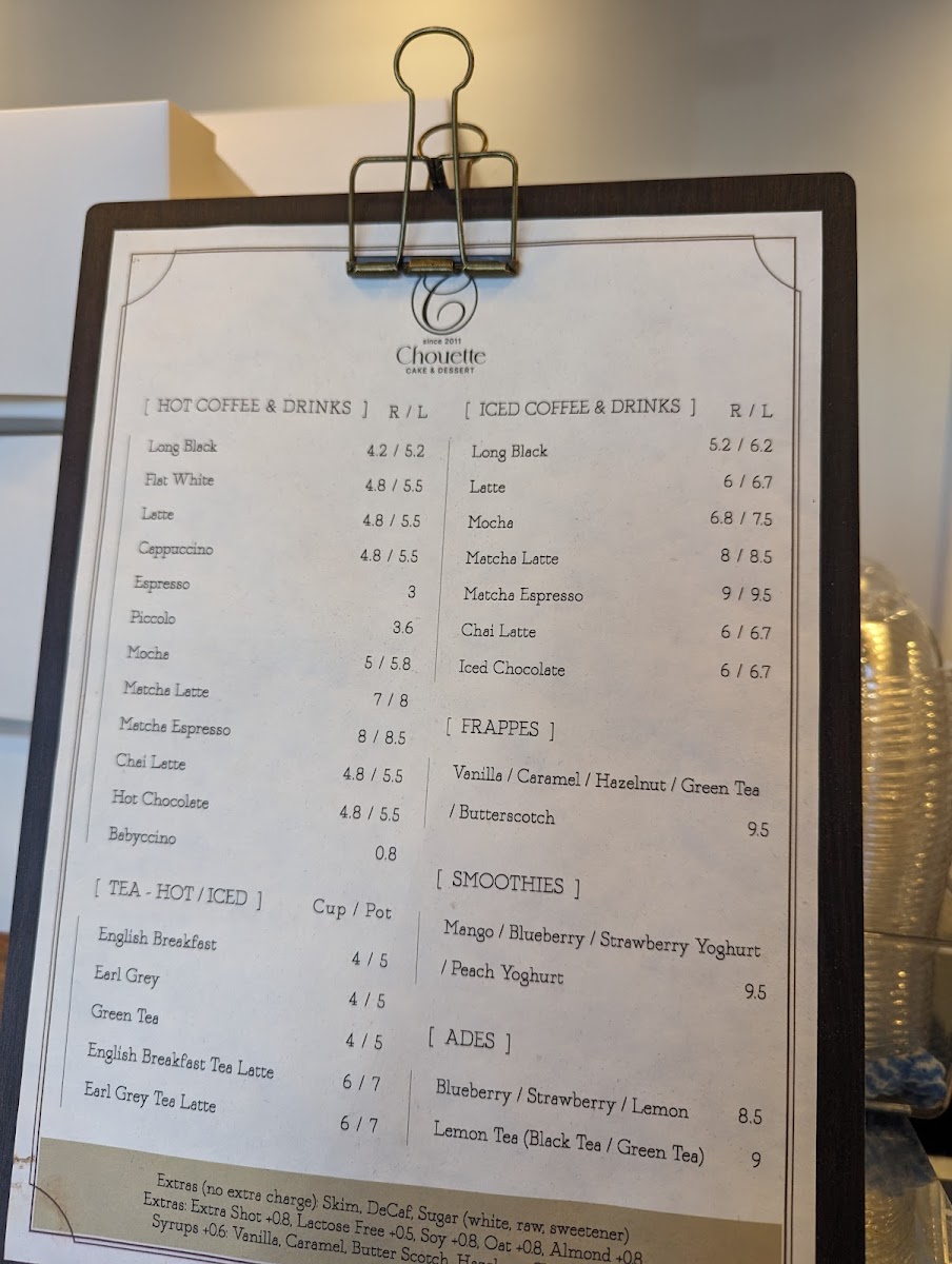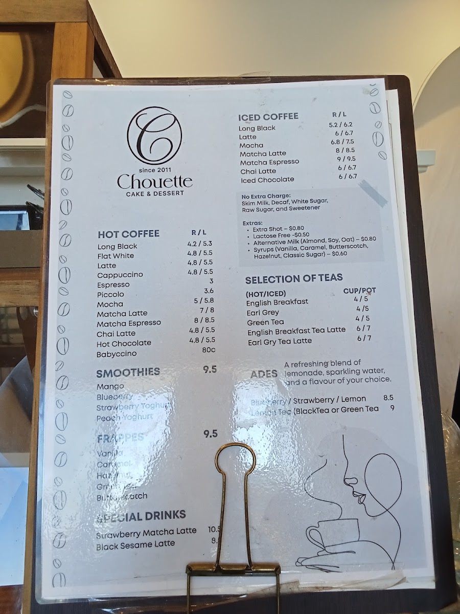 Cold Drinks and Smoothies: The menu features iced coffee selections like iced long black, latte, mocha, matcha latte, and iced chocolate. Additionally, fruit smoothies such as mango, blueberry, strawberry yoghurt, and peach yoghurt are available for a refreshing choice.
